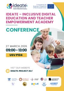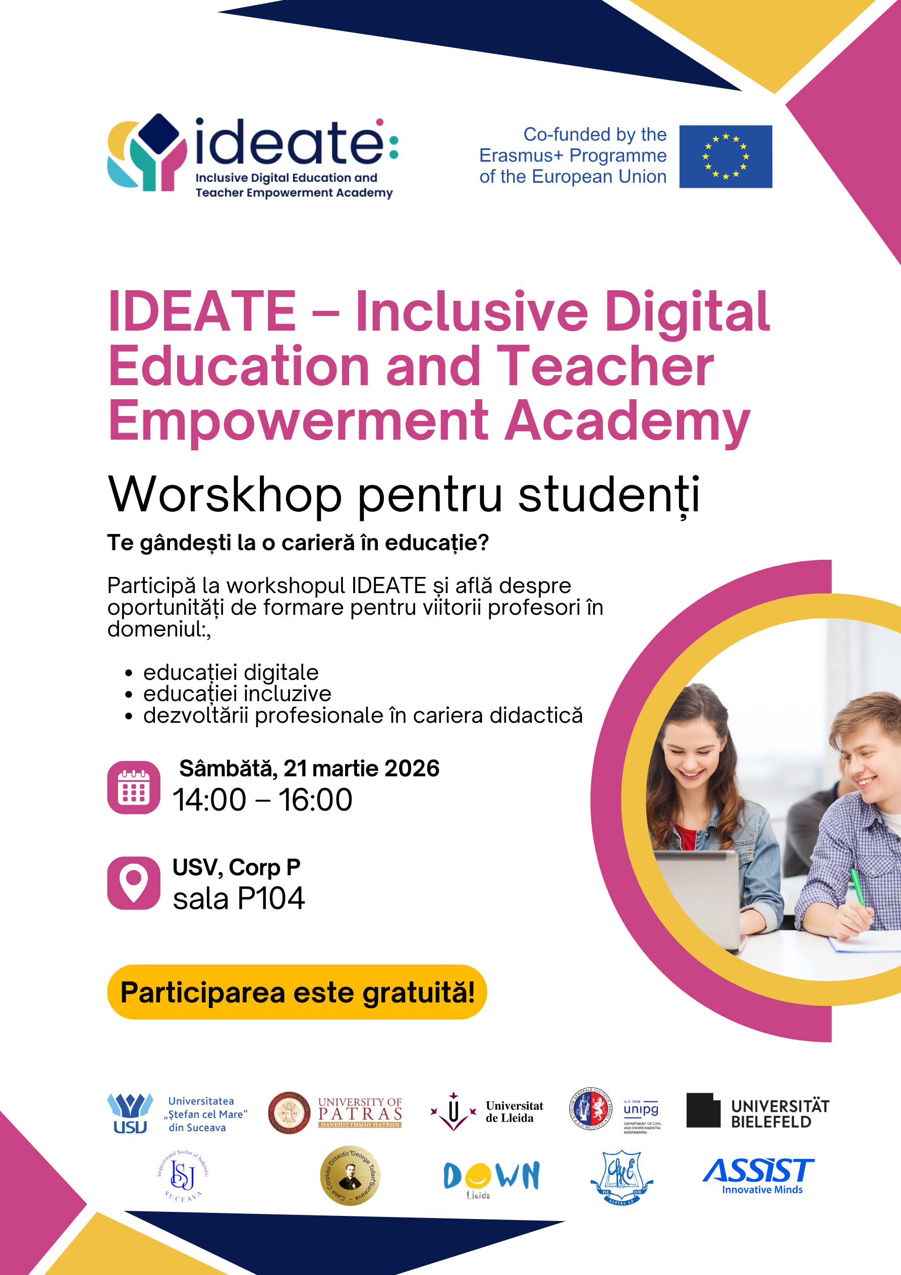 Facultatea de Psihologie și Științe ale Educației din cadrul Universității „Ștefan cel Mare” din Suceava organizează, în luna martie, două evenimente care marchează lansarea proiectului european IDEATE – Inclusive Digital Education and Teacher Empowerment Academy, finanțat prin programul Erasmus+.